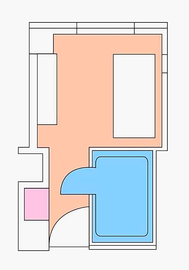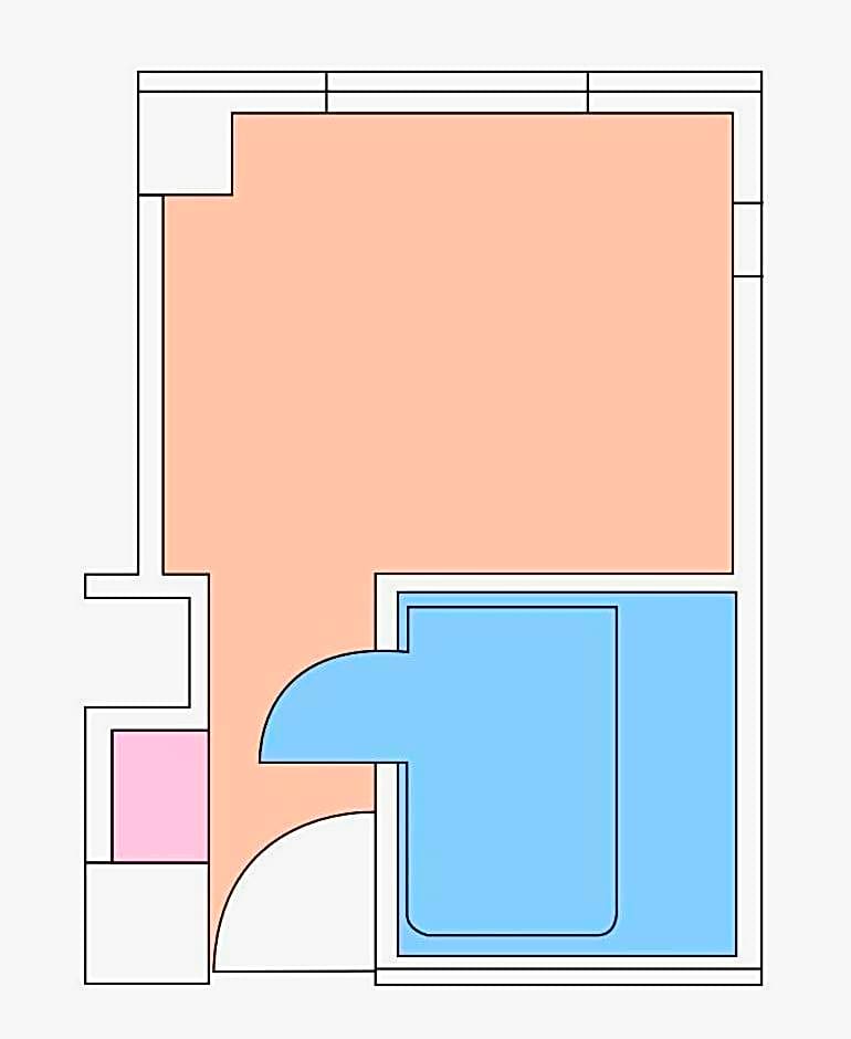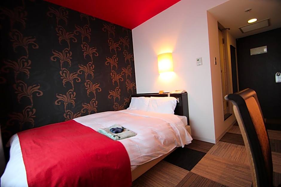 Compact room featuring carpeting, a double bed and a red ceiling. It’s furnished with an LCD TV, a fridge and an electric kettle. Yukata robes are provided and the attached bathroom comes with toiletries and a hairdryer. Free Wi-Fi and wired internet are available.